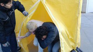 煙体験は、小さい部屋のようなテントの中に煙を充満させ、その中に入って体験するものでした。小さいテントにも関わらず、煙が充満すると何も見えません。これが本当の火災現場で起きたらと思うと、とても怖い気持ちになりました。